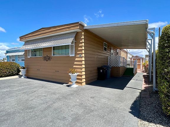 Lovely and in move in condition home available in desired 55+ La Canada Mobile Estates in Salinas. Huge in suite bedroom with walk in closet, and ample shower + private door to outside, second bedroom across from full bathroom, beautiful modern hutch in dining area, kitchen is pristine, freestanding gas stove. Living and Master have ceiling fans, tasteful earth tones. Sits at end of row, storage shed is included, ample ramp for smooth access to back door off carport, and front porch as steps on and off both sides. This property offers you the opportunity to beauty and nature of Monterey County, coastal living, minutes to 101, walking distance to shops, dining, walking, and many more amenities.