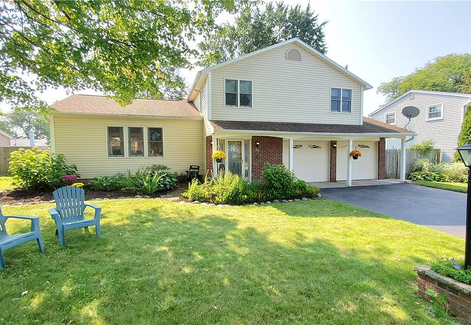 Here is a wonderful home to make memories! There is a space for everyone! A large open foyer welcomes you and invites you into the living spaces. Straight ahead is the Family rm with decorative fireplace and walls of windows/doors leading to the fantastic outside space. The updated kitchen offers lots of windows, hardwoods, beautiful cabinets and newer appliances (2019) over looks family room and is adjacent to the Dining and Living rm which offers hardwood floors and a wide open layout. Upstairs are three generous sized bedrooms and a full updated bath. Lots of storage in the hall access to the attic! The laundry room is new 2020. Need more space? check out the rec space/office in the basement (2020) The outdoor patio with covering is amazing! What a fantastic place to relax at the end of the day. Hot tub 2021 negotiable. Landscaping 2022. All new zone heating thermostats and wiring installed 2019. Hot Water tank 2020. WELCOME HOME! So close to xways, shopping and Irondequoit Bay! Delayed Negotiations until Wed. 9/21 at Noon.