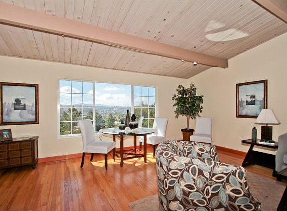 Expansive valley and Western Hill Views! Spacious sunlit LR/DR with high beam ceiling & fireplace, plus very large family/media room. Eat-in kitchen and master suite. Shady lawn area terraces down to wide deck & lower lawn with hot tub. Hardwood floors, dual pane windows, freshly painted interior. For craftsman - separate work shop plus tons of storage. Great San Carlos schools.