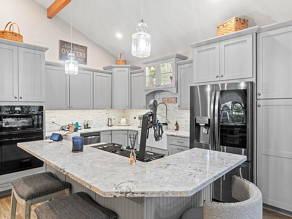 Cozy gas fireplaceCenter islandQuartz countertopsPrivate stone patioHigh-end finishesAbundant natural lightCustom shingle-style ranch