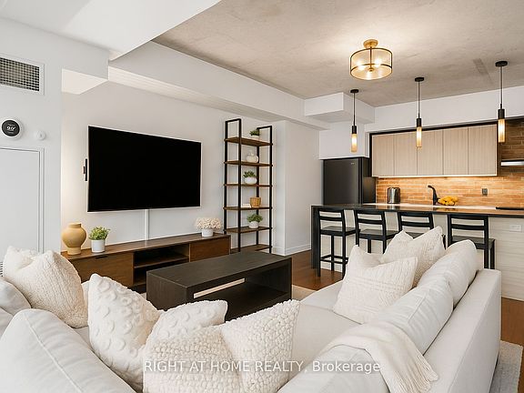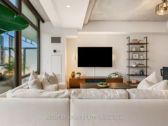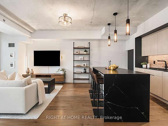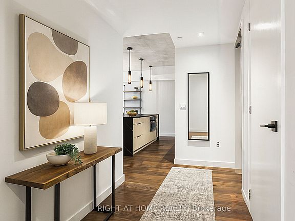 Morning light pours into this elevated 1+1 at 55 Stewart, wrapping the space in that soft, morning glow that makes the city feel calm for a moment. Perched on the 9th floor with an east exposure and a sweep of south sightline, this suite sits above the buzz of King West, close enough to feel the energy but just high enough to breathe. Inside, it's all about texture and tone: wide-plank hardwood underfoot, a redesigned kitchen with a proper island and high-end appliances, and a subtle loft-style edge that gives the home character instead of cliché. The open living/dining area flows naturally onto a real, usable balcony - room for a café table, a glass of wine, or a quiet scroll while the neighbourhood hums below.The bedroom is a true retreat, finished with Hunter Douglas motorized blinds so you control the light with a touch. The den is a genuine separate space - an actual work zone or guest nook, not a token cut-out in the hallway. Parking and locker are both included, which matters more than ever in this pocket of the city. All of this is anchored in one of Toronto's most sought-after lifestyle addresses, connected to 1 Hotel's celebrated amenities - rooftop pool, fitness, dining, and a lobby that feels more like a destination than a corridor. If you've been waiting for a King West condo that feels considered, upgraded, and quietly impressive rather than cookie-cutter, this is the one that will stay on your mind.