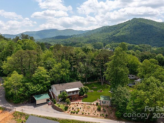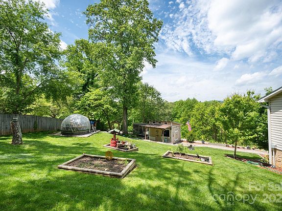Immaculately maintained home with unique outdoor amenities! Just 15 mins from downtown Asheville, this beautiful 3BR/2BA home blends comfort and charm. The kitchen features sleek stainless steel appliances: dishwasher, refrigerator, microwave, and gas range. Step outside into a gardener’s paradise—mature landscaping with fruit trees, geodesic greenhouse, raised beds, and stone patio create an ideal setting for relaxing or entertaining. Enjoy your private tiki bar or soak in the hot tub under the stars. Covered front porch offers serene mountain views, perfect for morning coffee. Inside, an ensuite primary bedroom with walk-in closet awaits. Upgrades include LVT flooring, updated baths, and a generator (2025). Two driveways provide ample parking, including RV space. Workshop with built-in workbenches and abundant storage.