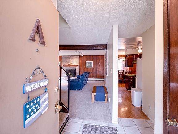 Spacious end-unit condo located at the end of a cul-de-sac with a welcoming front yard and some nice privacy. Inside provides updated windows and blinds as well as a slider door off the living room to access a neat wood deck and enclosed yard creating a great private outdoor space. The large living room is accented by a brick wood burning fireplace and connects nicely with the dining room. The dining area overlooks the backyard through a large picture window. The dining and kitchen areas have laminate flooring and the carpeting has been updated in the living room, up the stairway, and into the master bedroom. Upstairs provides two nice-sized guest bedrooms, one of which could easily be used as an office space. Additionally, there is a large master bedroom which is well located at the back corner of the property overlooking the deck area and backyard, and includes a large closet space. There is a full bath nearby providing a double sink vanity and ample counter space for all the upstairs bedrooms. There is a powder room and laundry space conveniently located off the main entryway as well as two storage closets. There is another storage area providing additional access to the home via a door located off the deck. Two parking spaces and a storage shed at the front of the property provide convenience. Great location near shopping, downtown, restaurants, and parks as well as easy access to NM-502 for commuting and traveling.