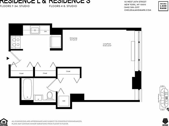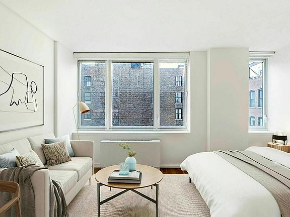 This alcove studio faces east and features a separate gourmet kitchen with stainless steel appliances and stone countertops, an in-unit washer and dryer, and multiple closets. Chelsea Landmark is a collection of sophisticated rental apartments located at the intersection of NoMad, Flatiron, and Chelsea. Luxury services include an on-site attended garage, building-wide Wi-Fi, wall outlets with USB charging ports, 24-hour doorman and concierge service, and an expansive landscaped roof deck with panoramic city views. Our newly renovated Club 3 features a resident lounge, game room with golf simulator and billiards, library, party room, state-of-the-art fitness center with yoga studio, and patio with barbeque grills. Club 3 members can access complimentary fitness classes and signature events as well. Prices and incentives subject to change. Photos and floor plans may be of a representative unit.