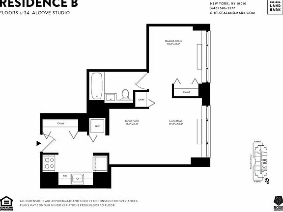 This ALCOVE STUDIO/1BA has outstanding views to the east. There is a separate sleeping alcove, and a washer and dryer inside the apartment. The partial wall makes this home feel more like a one bedroom. Chelsea Landmark is a collection of sophisticated rental apartments located at the intersection of NoMad, Flatiron, and Chelsea. Luxury services include an on-site attended garage, building-wide Wi-Fi, wall outlets with USB charging ports, 24-hour doorman and concierge service, and an expansive landscaped roof deck with panoramic city views. Our newly renovated Club 3 features a resident lounge, game room with golf simulator and billiards, library, party room, state-of-the-art fitness center with yoga studio, and patio with barbeque grills. Club 3 members can access complimentary fitness classes and signature events as well. Prices and incentives subject to change. Photos and floor plans may be of a representative unit.