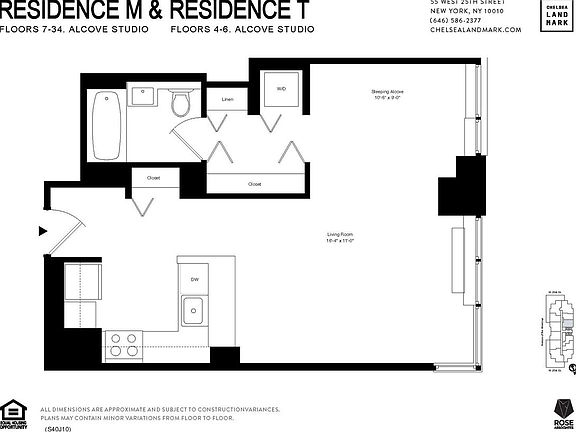 This stunning alcove offers a large living area with a separate sleeping alcove and lots of storage space, as well as an in-home washer and dryer. Enjoy an open kitchen, along with a breakfast bar. Chelsea Landmark is a collection of sophisticated rental apartments located at the intersection of NoMad, Flatiron, and Chelsea. Luxury services include an on-site attended garage, building-wide Wi-Fi, wall outlets with USB charging ports, 24-hour doorman and concierge service, and a landscaped roof deck with panoramic city views. Our newly renovated Club 3 features a resident lounge, game room with golf simulator and billiards, library, party room, state-of-the-art fitness center with yoga studio, and patio with barbeque grills. Club 3 members receive complimentary fitness classes and signature events. Pricing and availability subject to change. Photos and floor plans may be of representative unit.