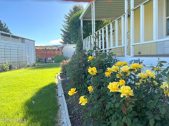 Charming 2 bed, 2 bath home in the premiere 55+ Broadmoor adult community of Yakima. This 1,152 sqft home features a semi-open floorplan, ideal for hosting or entertaining. Find yourself enjoying the two covered porches, and two storage sheds/workspaces. The bedrooms are spacious, and there is plenty of storage throughout the home. Some updates have been completed which includes blown-in insulation in the attic and crawlspace in 2018, a new furnace and heat pump in 2018, the roof was fully sealed in 2020, and the refrigerator was new in the last few years as well. Some windows have been upgraded to vinyl while others have storm windows for additional efficiency. There are some beautiful easy-to-maintain garden beds in front of the home, and a full sprinkler system surrounding the home. Lot rent is a base amount of $650/mo plus utilities which is no more than $50 a month. Utilities cover W/S/G. Other perks about the park are the clubhouse with a pool, workout room, and weekly events to engage residents. The grounds of the community are maintained well. The seller loves the ability to watch planes landing at the airport from the front porch. You may find yourself wanting to live the relaxed Broadmoor life! Schedule a tour today!