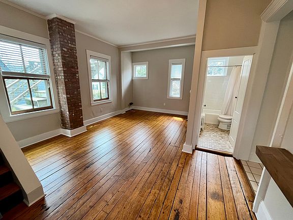 Located in the historic point Neighborhood, this two bedroom, two bathroom townhouse features original hardwoods floors throughout and has just been professionally painted. The first floor has a full bathroom, open living room and dining area, a galley kitchen with granite counters, and stainless appliances. On the second level you have a large open room, great for an office or additional living space, off of that room you have two bedrooms and another spacious full bathroom. The living room has access to the basement which you can use for additional storage, and a brand new stackable washer and dryer have just been installed. This apartment comes with a small courtyard for a table and grill. On street parking One small pet may be considered with the owners approval. Tenant is responsible for natural gas heat, electricity and water.