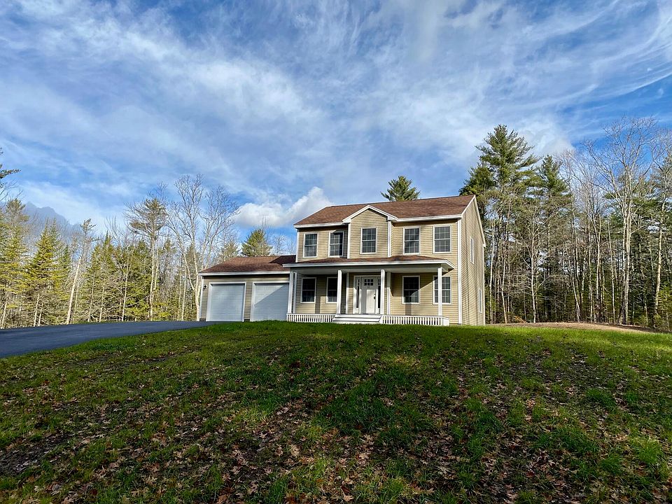 Just completed! This 3-bedroom/2.5-bathroom colonial with 2-car garage is perched above the road on a 4.63-acre parcel. You'll love this sunlit open concept featuring a granite kitchen, stainless steel appliances, luxury vinyl plank flooring, 1st floor laundry, relaxing farmer's porch and a private rear deck. The primary bedroom includes its own bathroom and walk-in closet. The full basement is great for storage with a rear entrance door to the backyard. Convenient country setting surrounded by acres of protected open space just 4 miles to Gorham Village or easy access to points south like Scarborough/Saco.