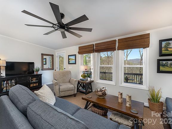 Enjoy amazing year round views in this mountaintop home in sought after Fairview. This beautifully updated modular home boasts ALL NEW roof, windows, HVAC, kitchen with granite, master bath, LVP flooring throughout, covered back deck and new driveway with ample, level parking. The light and bright open floor plan with split bedroom layout has awesome views from the large deck and most every room. You'll love the .85 acre lot with low maintenance "no mow" yard with separate outbuilding for storage. The charming, peaceful and walkable neighborhood is just 2.5 easy miles to grocery and necessities, and only 18 minutes to vibrant downtown Asheville's popular shops and restaurants. Plus a 6 person hot tub with mountain views to boot! Short term rentals allowed!