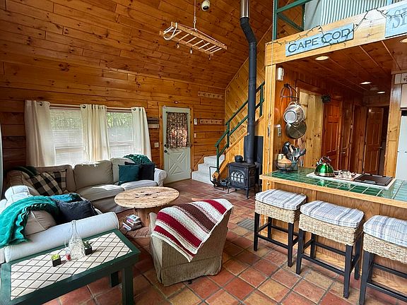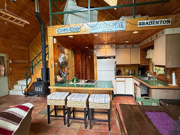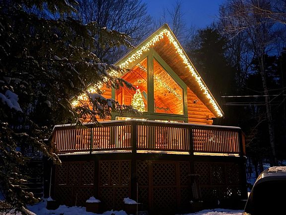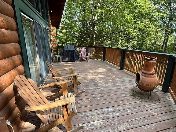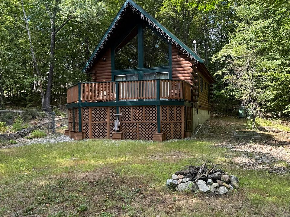 Log Home Chalet with Seasonal Views of Pleasant Mountain! This well-maintained 3-bedroom, 1-bath log home is located at the top of Whitetail Ridge and offers seasonal views of Pleasant Mountain. The home features an open-concept layout with knotty pine cathedral ceilings, tile floors, and large windows that bring in plenty of natural light. A wood stove adds warmth and character, while the large deck and fenced-in yard provide great outdoor space. Just minutes from Pleasant Mountain, and close to Bridgton Village shopping, lakes, golf, and snowmobile trails. Convenient to North Conway, NH, and Portland, ME. Move-in ready and ready to enjoy.