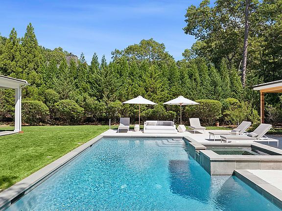 sq. ft. of living space plus a heated gunite pool, spa, and pool house. Interiors beam with natural light that highlights how meticulously maintained the home has been since it was built in 2017. Sophisticated and chic interiors are outfitted elegantly with gorgeous decorations for luxury living and entertaining year-round. The great room encompasses a large living room, eat-in kitchen and breakfast nook that features sliding glass doors that lead to the rear grounds, pool, and pool house. Premium appliances and a tucked-away butler's kitchen lead to the formal dining room. Each of the 5 bedrooms are well-sized and ready to accommodate loved ones and guests, including an ensuite primary with an oversized luxe bath with free-standing soaking tub and glass-walled shower. Enjoy dining al fresco on the covered patio with an outdoor living room and large bluestone patio surrounding the heated gunite pool and spa. Enviably located in between East Hampton and Sag Harbor Villages this rental retreat delivers the quintessential Hamptons experience.