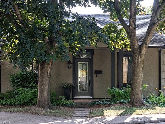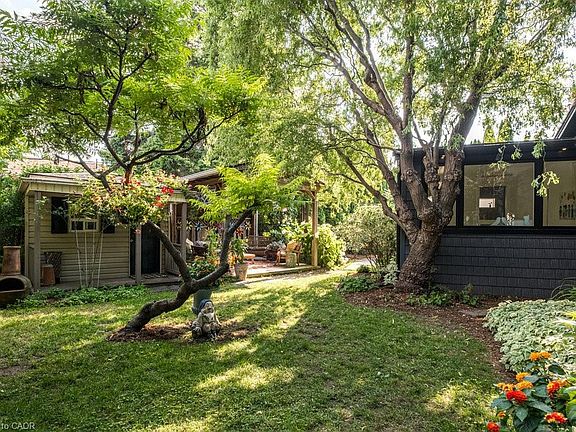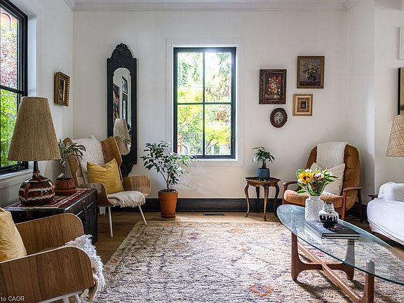 Prime Bay Area North End Neighborhood. Situated on the Wood Street West bend makes for a unique lot with stellar amenities - two driveways, single car garage and enchanted garden living. This c. 1870 cottage will have you at hello. The open concept living, dining and kitchen enjoy high ceilings, huge windows, engineered Canadian Oak plank flooring and fresh neutral decor. Modern kitchen with quartz countertops and breakfast bar, custom wood cabinets and recent stainless steel appliances. Main floor family room wrapped in natural light and views of the garden is, and will remain for you, a favourite space. King sized primary with ample closets, second bedroom and full bath with free standing soaker tub, floating sink, wet room and sublime finishes is marvelous. Downstairs you will find entertainment room, storage, full bath and laundry. Mud room entrance with easy access to garage is a welcome feature. Updates abound including: rooves, soffit, fascia, siding, windows, doors, bathroom, kitchen, flooring, garage walls and ceiling +++ Superb location steps to Pier 4, Harbour and GO. A one of a kind offering.