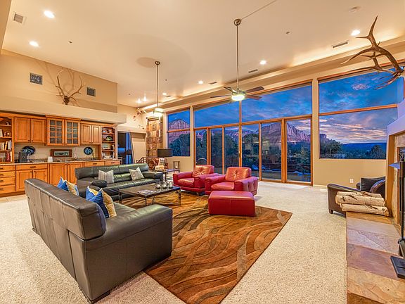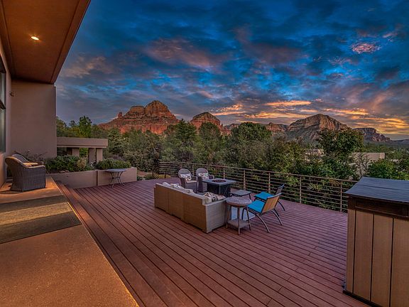 Out of this world panoramic Red Rock Views! Gorgeous sunrise and sunsets to behold from the viewing decks to capture all Sedona has to offer. Famous Madole home designed and inspired by the Chapel of the Holy Cross. Major renovations done in 2004 including elevated master bedroom, kitchen, great room and three car garage. The great room features a Chapel of the Holy Cross inspired fireplace, floor to ceiling windows to bring the brilliant colors of the everchanging red rocks inside. Open and bright kitchen features stainless steel appliances with granite counters. Featuring two master suites, two guest bedrooms with jack and jill bathroom. Separate in-law quarters plumbed for a kitchenette. Currently being used as a very successful luxury short term rental. Furnishings are available
