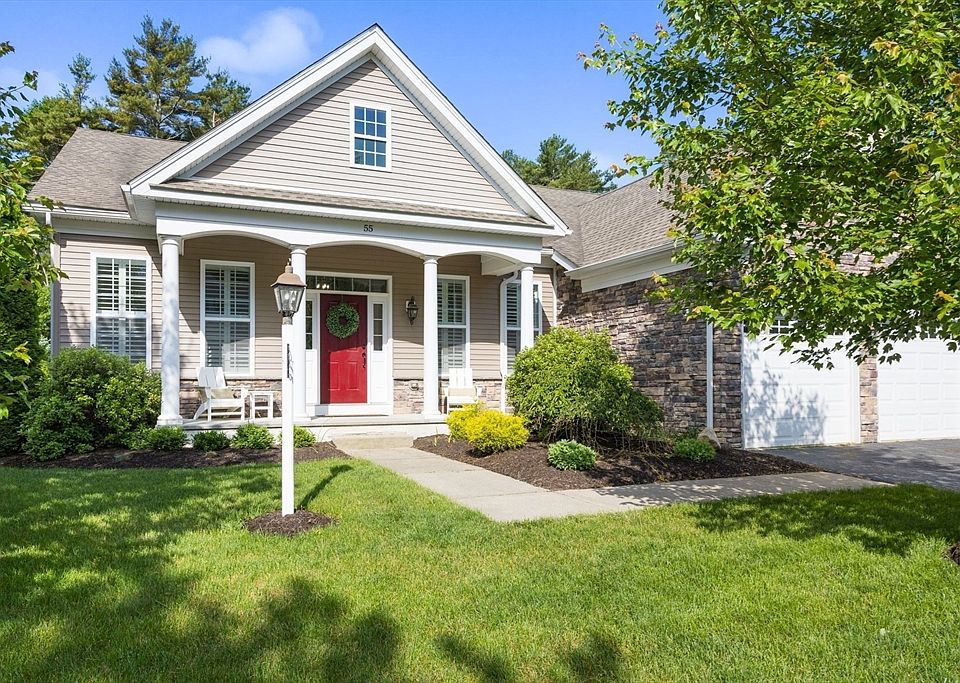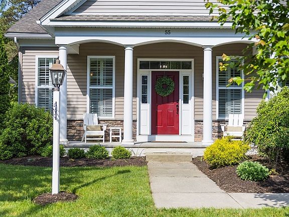 Beautiful " Tradition" style home in the Pinehills built by Toll Brothers. The large extended living room with ceiling fan and fireplace opens to a fabulous gourmet kitchen including granite counter tops, stainless steel appliances, upgraded cabinets, pantry and dine-in area. Sunny open sunroom with sliders to deck with private wooded views. Two floor-to-ceiling pillars enhance the entrance into the formal dining room which boasts plantation shutters, a tray ceiling and double crown molding. Spacious primary bedroom with two walk in closets and full bath with cultured marble double vanity and a large Roman tub. The 2nd and 3rd bedrooms are both located on the first level with a handicap accessible full bath. Other special features within this home include hardwood floors and plantation shutters throughout. This home is a perfect place for family, friends and entertaining.