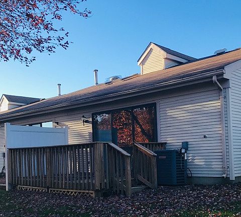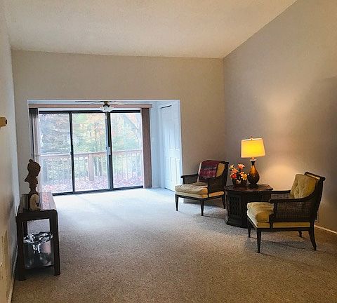 The Club Community. Move in ready with enclosed Sunroom, relax on the private wooded deck, detached one car garage. Vaulted ceilings in living room. Sunroom with storage closets. Kitchen with a built-in counter. Master Bedroom good size closet and master bath. Convenient to shopping, highways. Washer and dryer less than 6 months old. The table/cabinet unit in the kitchen is removable. The community offer clubhouse, pool, tennis courts, trash and snow removal.