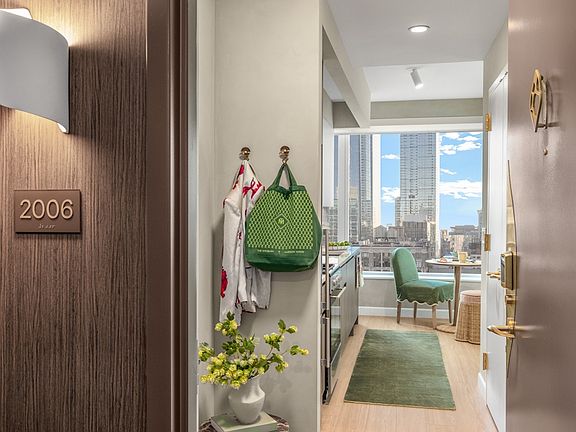 This distinct and intelligent studio is thoughtfully designed with high-end finishes that immediately immerse you in luxury and style. The gourmet windowed kitchen is fully equipped with quartz counter-tops, beveled and polished slate subway tiling, white lacquer and ash grain cabinetry, top-of-the-line appliances and ample storage. For your additional convenience, this home is complete with an in-unit washer and dryer. The 06 line allows for separation between created spaces and is perfectly framed by two over-sized windows complimented by additional sound proofing allowing you to enjoy the perfect view of sunset. The luxurious bathroom is outfitted with a gorgeous mosaic tile, fluted porcelain accent wall and an abundance of storage.