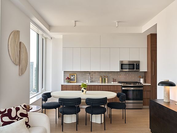This two-bedroom, two bathroom apartment is thoughtfully designed with high-end finishes that immediately immerse you in luxury and style. The gourmet windowed kitchen is fully equipped with quartz counter-tops, beveled and polished slate subway tiling, white lacquer and ash grain cabinetry, top-of-the-line appliances and ample storage. For your additional convenience, this home is complete with an in-unit washer and dryer. The living room is quite generous in space and boasts of high ceilings with double exposure and double paned wrap around windows highlighting your impressive views of the Hudson River, Empire State building and the classic New Yorker sign. Both bedrooms will accommodate a King-size bed. The primary is complete with large windowed en-suite, double vanity and both bathrooms are outfitted with a gorgeous mosaic tile, fluted porcelain accent wall and an abundance of storage.