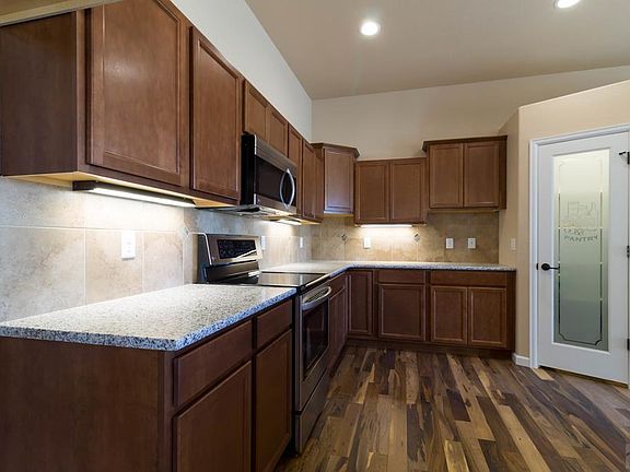 This bright open split floor plan features 3/4" solid Tobacco Road Acacia hardwood in great room, kitchen and dining area and tiled landings by all entry doors. Two tone paint. The kitchen sparkles with granite countertops, tiled backsplash above black granite composite kitchen sink, LG stainless steel appliances (including smooth top electric range, dishwasher & microwave hood) and spacious corner pantry. The secluded master bedroom has Stainmaster carpet, ceiling fan, big walk-in closet, boxed bay with dimmable recessed lighting. Master bathroom features dual vanities, tiled flooring, custom tile from floor to ceiling in the walk-in shower with frameless glass enclosure. The 2 bedrooms feature Stainmaster carpet, ceiling fans and ample closet space. The bathroom features granite countertops, tub/shower with custom tile floor to ceiling. Built to latest energy code, 2x6 all exterior walls on 16" center, blown insulation for R24, double wrapped crawlspace wall R22, attic blown to R49, 2.5 ton 13 SEER central air, Jeld-Wen Low E Argon filled energy saving windows, upgraded therma-tru front door and patio door, synthetic stucco. 3 car insulated R11 walls, R19 ceiling, sheetrocked/firetapped. Covered front porch, 12.6'x14' covered back patio. Upgraded birch shaker style cabinet with easy close drawers throughout, oil rubbed bronze faucets, LED lighting inside/out, tiled mudroom, decorative stone and much more. photos are of a similar home.