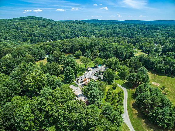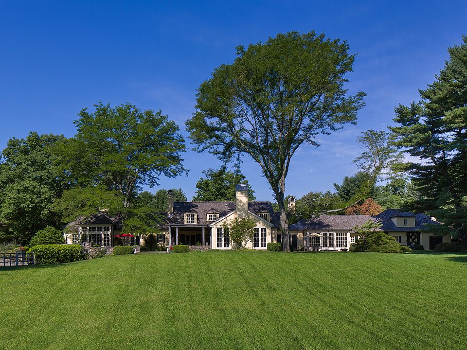 Exceptional Country Estate on 9 level acres on one of the most picturesque country roads in Bedford. Relaxed luxury begins with the fabulous great Room with 18' beamed ceilings and chef's kitchen surrounded by a den and informal dining area all open to a large entertaining terrace. Soaring library with barn wood ceiling beams and 6 sets of French doors open to the stone terrace and a broad and gracious loggia with adjacent sparkling pool. First floor master wing includes dual dressing rooms and spa bath. Guest wing with courtyard entry offers two separate suites. Additional 2 family-style bedroom suites on the 2nd floor. Separate 3 bedroom/2 bath guest cottage. Sweeping lawns, formal gardens and specimen trees all with direct access to the BRLA and surrounded by major estates. Additional 1,500 square feet in walk-out finished lower level with games room, bath, cabana, home theater with a concession stand.