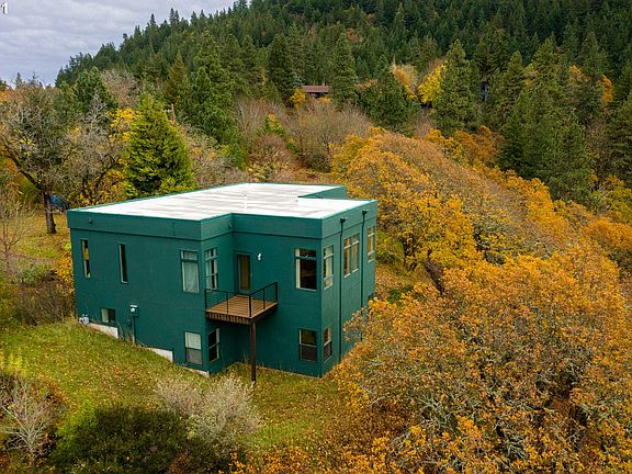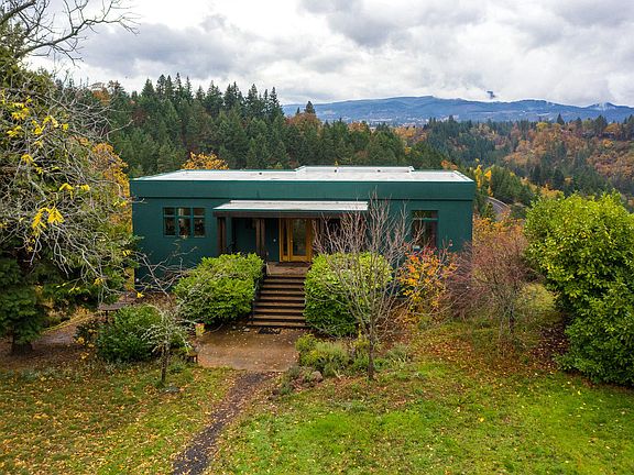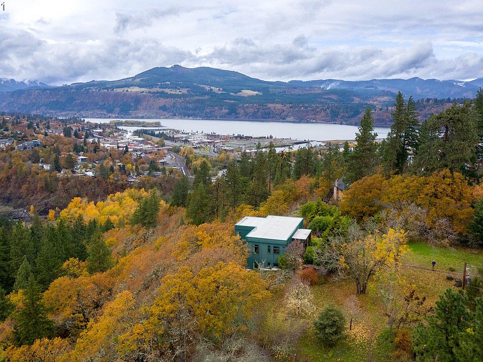 This home checks the boxes. Location. Good layout. Privacy. Views - Columbia River, Mt. Defiance, the lower HR valley. 1.29 acres. 2002 construction by builder Bruce Stocker. Stucco exterior. Radiant floor heat powered by on-demand natural gas. Bamboo floors. Custom metal work. Marathon electric hot water heater. Primary bed upstairs. 3 beds down. House and yard on upper level area of lot, sloping more steeply to west and south. Storage shed near parking area. Plus an outdoor pizza oven!