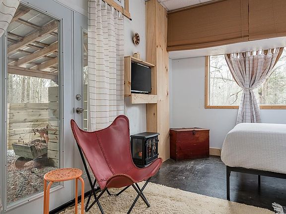 Beautiful, rustic, peaceful farm 2 miles from 1-20 in Covington. Stylish studio apartment fully furnished on bottom floor of barn with lots of open space. Ideal for single person. Concrete floors, lots of windows and tin-roof patio. Private bath (shower only) with windows overlooking the woods. Laundry is shared with loft apartment. Dog and cat live here. Lease month to month via Airbnb. Utilities and laundry included, Roku TV, bring your own passwords. (excessive electric bill will be prorated).