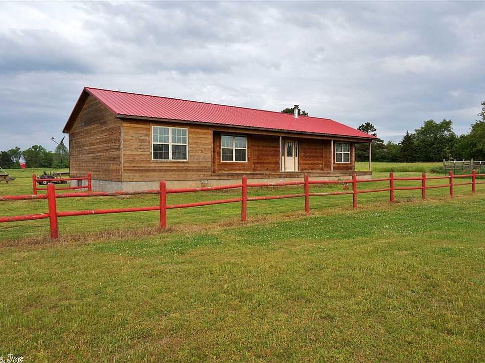 Beautiful 2010-built country home atop 21 acres of fenced farmland. This home has it all -- hardwood floors, vaulted and trey ceilings, tiled walk-in master shower, split floor plan, large kitchen, and a safe room built inside the home built to withstand an F-5 tornado. Great use of wood, beams, and sheet metal throughout the home give it that rustic cabin feel. Outside, there is a small pond, barn, and equipment shed. Property is fenced and ready for horses or cattle. Seller is motivated -Bring an offer!