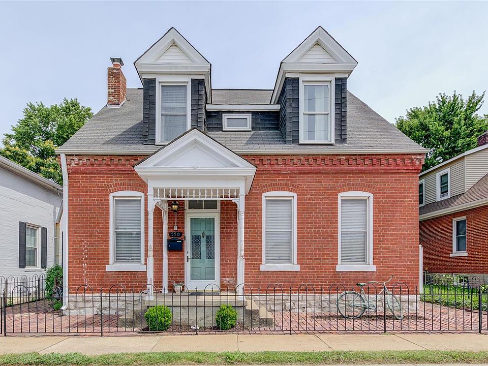 This historic, brick home in St. Charles was built in 1850. It offers a charming mix of historic features & today's amenities. The first floor of this 1.5 story welcomes w/10 ft. ceilings, wood floors, gas fireplace & an exposed brick wall. Attractive kitchen offers tall cabinets. Dining room has a stain glass window to the enclosed back porch & an open, spindled stairway to the upper level. Main floor master bedroom and laundry as well as a full bath on each level. The 17x14 secondary bedrooms upstairs have dormers w/appealing vaults & newer, wood-look vinyl flooring. The 2-car oversized garage has storage & workshop area & adjoins a large, covered carport or patio area. Spacious, back yard w/brick patio & quaint, original home is full of possibilities. Location is walking distance to historic St. Charles Main Street & super convenient to the hospital, Lindenwood University & all that the heart of St. Charles offers.
