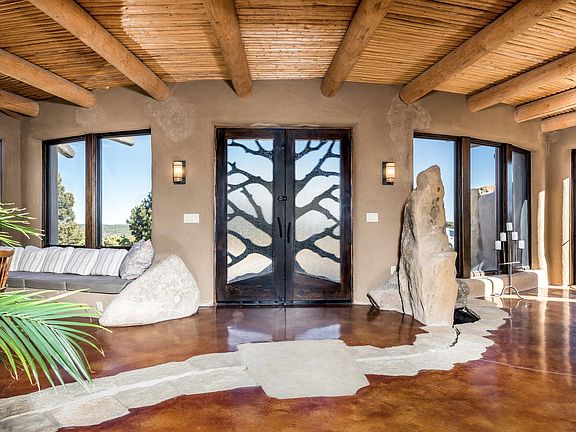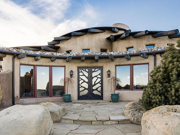 Custom built, peaceful sanctuary located in the foothills of the Sangre De Cristo mountains. This home was inspired by the surrounding environment using local earth, wood & stone materials to bring an incredible vision to life. A series of nestled cylinders & curved windows allow the perfect flow of light and create panoramic views. Large sandstone rocks line the entryway & fireplace creating thermal mass & natural elements within the home. Entertain in the open kitchen or gather in the perfected dining room gazing at the endless views while savoring the advanced energy efficient technologies in this masterpiece. The organic details of this home offer a once in a lifetime experience.
