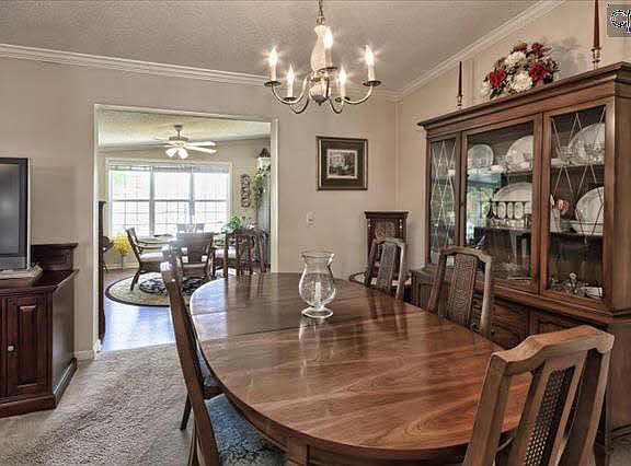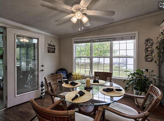 Beautifully maintained one level w/ split floor plan! Nice flat lot, private pier w/floating dock, 90 ft. shoreline on big water. Gigantic eat-in kit w/ island that seats 4, loads of cabs w/built in china cab and 2 pantries, GR has FP w/gas logs and vaulted ceiling, luxury MBR suite w/dual walk-in closets, dbl vanity, sep shower and whirlpool tub. Fml DR area, Big laundry rm w/sink. Sunroom, huge deck w/Sunsetter awning, firepit and gas grill. 10X20 workshop w/elec. New HVAC Jan 2014. Crown molding and Levelor blinds throughout. Extra long double carport.