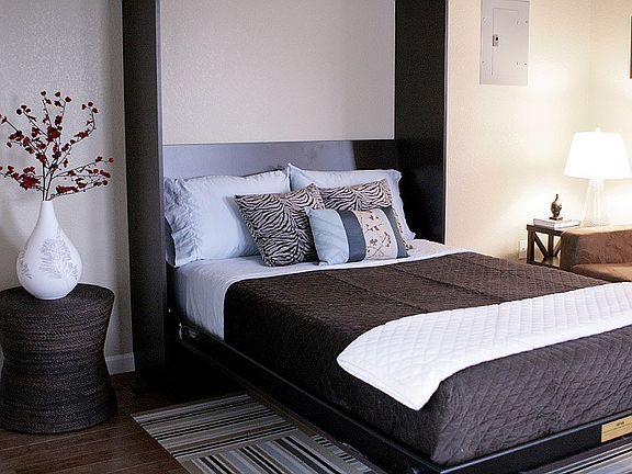 Contemporary paint colorsDesigner cabinetrySlate and hardwood floorsGranite countertopsMurphy bedsFold-out desksAll-new appliances