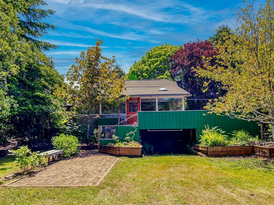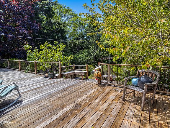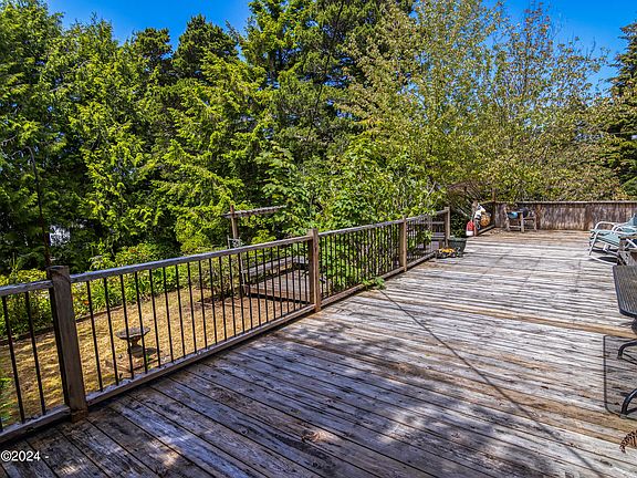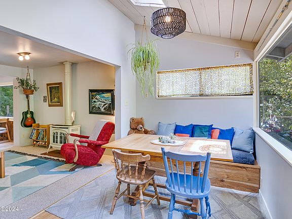 Here's your chance at a little bit of paradise... Ensconced in mature trees and flowering foliage is a most charming 2-bedroom country cabin on an oversized lot. Natural light filters through skylights and a wall of windows on the enclosed front porch. Cozy living room with propane stove, open to the kitchen and sunroom for an expansive feel. Large decks encircle the home, offering supreme privacy and the sounds of the ocean. The kitchen, with functional pantry and laundry room, leads to the huge enclosed sunroom. The westside yard is enchanting and perfect for gatherings, barbecues, and croquet tournaments. Oversize triple lot. All this, close to Yachats beaches and wonderful shops, restaurants, and community events.