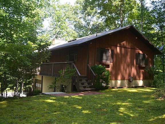 Beautifully maintained 2/2 cabin-style home in a lovely subdivision, paved to the door. Open floor plan. Enjoy lots of privacy and quiet, winter views, and abundant wildlife. Spacious covered screened porch invites relaxing, visiting or quiet time. Immaculate and move-in ready, this clean and comfortable mountain home is conveniently nestled in a tree house setting. Situated a short half mile above Parker Meadows Community Park, ball fields and level walking path along the Cartoogechaye Creek. Perfect for dog walking and exercising; the Park offers a playground plus inviting areas for playing in the Creek and fishing - a Community Park for all ages. But it gets even better: This home is just 10 minutes from downtown Franklin, North Carolina, and only five minutes from restaurants and shopping. Easy access to 4-lane highway so you can travel to all your favorite places in no time. The $550 POA dues cover the paved road maintenance and all water usage for added value. Laundry room is in the finished basement and a third bathroom can be added for downstairs convenience. There is also plenty of ceiling space for air conditioning ducts for central heat and air installation.