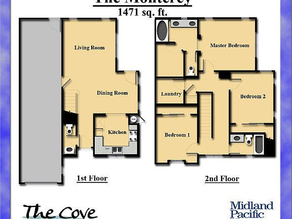 Welcome to The Cove at River Oaks! This desirable Monterey plan home offers a wonderful layout, with 1471 square feet, 3 bedrooms, 2 1/2 baths and a tandem 2 car garage. Downstairs you'll love the open feel of the beautiful kitchen and spacious living room with upgraded wood laminate flooring. Upstairs you'll find 2 guest rooms, convenient laundry room, hall bath, and the master suite with walk-in closet & double vanity. This newer home provides low maintenance yards plus a large concrete patio, all just steps away from the common park area that offers 2 play structures and a bocce ball court! The Cove is located near Kermit King School and the River Oaks Golf Course, and close to shopping, restaurants, wineries, and Highway 46 & 101. Call today for your showing!