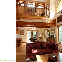 This custom Contemporary home is sited on 3 wooded acres. It offers an open floorplan, spacious kitchen and cathedral ceiling living room with exposed beams and cozy woodstove. The screened porch and daylight basement connect indoors with lovely yard.