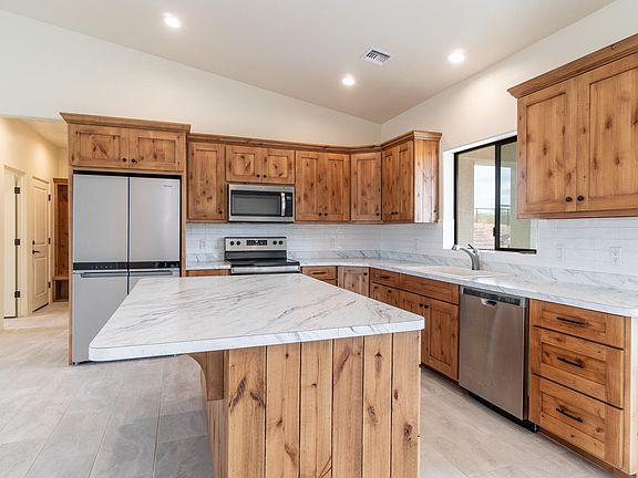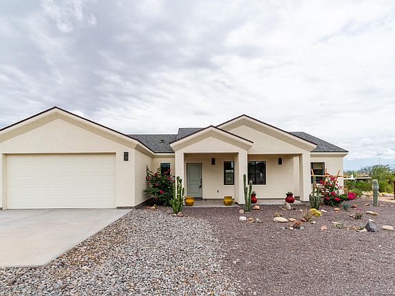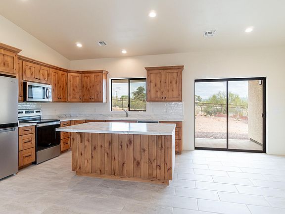 Welcome to the epitome of small-town charm, Wickenburg is perfectly pared with modern luxuries! This beautiful custom residence is a haven of comfort and sophistication. Step onto the front porch, you'll be captivated by the unique features that make this property truly special. Inside, vaulted ceilings, custom cabinets crafted by local artisans, Hunter Douglas shades, a neutral color palette, recessed led lighting, tile floors throughout and industrial-style 3 blade fans create a warm and inviting atmosphere. Create lasting memories w/family and friends in the oversized great room, open concept kitchen boasts stainless steel appliances, including a Frigidaire 4-door French Refrigerator, and is complemented by a stylish tile backsplash. The primary bedroom is a sanctuary featuring a semi-custom oversized closet for your wardrobe needs and indulge in luxury with a walk-in tiled shower and elegant Corian counters. The property is embraced by a hand-cut, welded, and rusted pipe & wire woven mesh fence, a testament to local craftsmanship, low-maintenance landscaping, and surveyed & staked ensures that the beauty of your home extends beyond its walls. Ideally situated for both raising kids and enjoying the freedom of empty nesters. Convenient walking distance to schools, grocery store, and golf course. Outdoor enthusiast dream, tons of room to store your toys, explore nearby off-roading trails, hiking trails, Hassayampa River Preserve, Vulture Mountain Recreation Area, and historic mines. Immerse yourself in the community spirit w/ seasonal rodeos and festivals. Welcome Home!