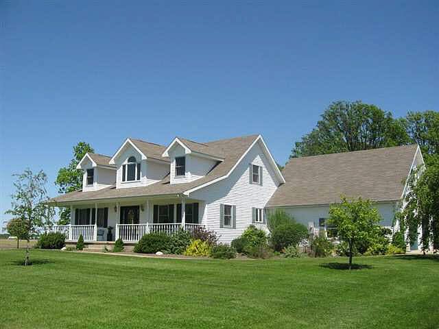 Beautiful Cape Cod style home on 5.27 acres. Enter into large foyer from full covered front porch w/open stairs to second level which has 2 BRs w/dormers & balcony overlooking GR w/fireplace & French doors leading to wood deck. Large eat-in oak kitchen w/lots of cabinets & ceramic tile flooring plus formal DR. MBR & bath on main level. Finished basement w/rec room, family room area, kitchenette/bar, fireplace, 2 storage rooms. This home is immaculate w/so much room to raise the family. Poured basement walls, 2 gas log fireplaces, attached 2.5 car heated garage plus 32x48 detached garage w/2 doors plus rear sliding. Large unfinished bonus room over attached garage. Easy access to I-69 plus just minutes from Muncie, Chesterfield, Yorktown School and Anderson. Paved drive plus patio area, 3 acres of woods and lots of flowering trees and flowers. A real delight to show. SF includes basement *Dir: 332W to Madison/Delaware Co. Line (500E in Madison
