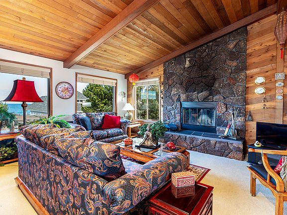 Ocean view home with a private setting on .29 acre lot(s) (adjoining tax lot 4900 included). The main floor has an open layout with beautiful wood ceilings and a wood burning fireplace that creates an intimate warm feeling. Or, you can cozy up with a good book in the 5X23 heated sunroom located off the master suite on the main level. The ground floor is home to a spacious 2nd Livingroom, Sauna, Full Bathroom and laundry room. Oversized garage with work shop and a 19X22 heated hobby room off the garage (not included in the square footage). Outdoor features include a greenhouse, wood shed and two expansive rear decks perfect for entertaining.