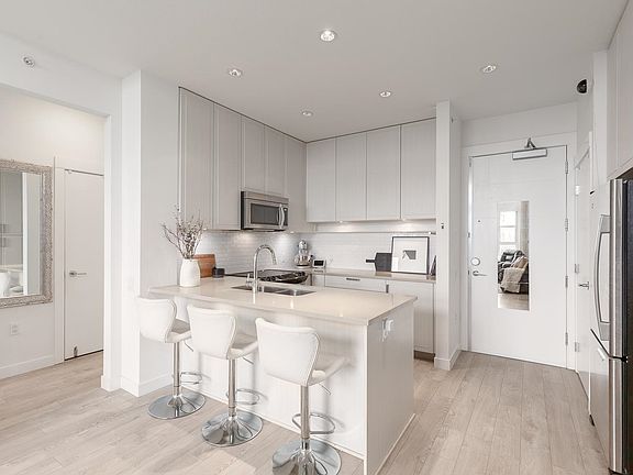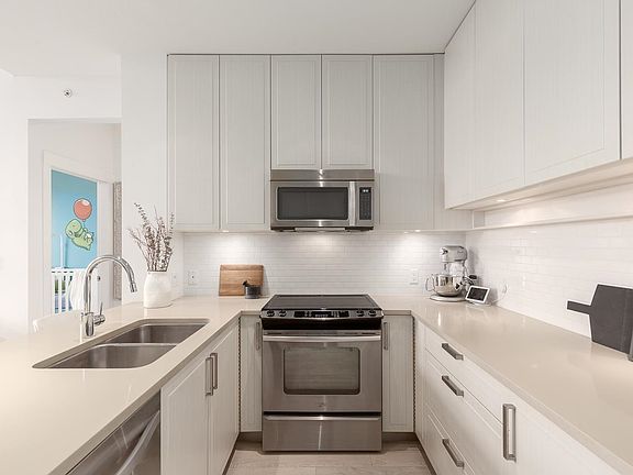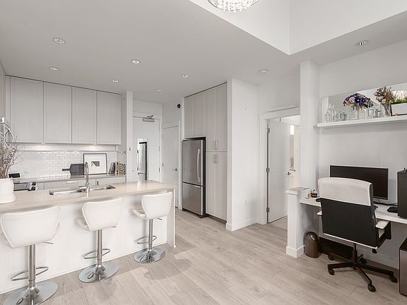 Penthouse residence with panoramic views of the mountains at the desirable 'Fremont Green' by Mosaic. Enjoy stunning high ceilings in the spacious living and dining rooms, and high quality finishings throughout including stainless steel appliances, radiant floor heating, quartz countertops and a large patio. The full-height kitchen has loads of cabinets and there is a built-in work station off to the side. This bright and efficient floor plan offers bedrooms on opposite sides and double closets in the primary suite. The ensuite bathroom features double sinks and a large shower. Many great upgrades: backsplashes in the bathrooms, large capacity LG washer and dryer, custom made wardrobe organizer in master, vanity, and towels cabinet. 1 Parking, Pets & Rentals OK