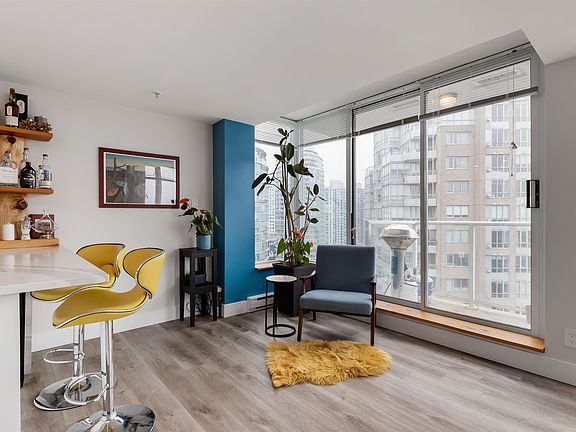 Fantastic renovation and breathtaking views at this unique studio converted to Junior 1 Bedroom at Taylor! This residence has a brand new, thoughtful renovation featuring a totally open concept, large kitchen offering plenty of counter space, new high end appliances including built in oven & range, plus built in wine fridge/beverage center. Matte soft grey cabinetry, recessed lighting, and quartz countertops, and bar seating for two. The creative queen-size sleeping nook is wrapped in wood and includes clever details such as recessed ambient lighting, integrated electrical outlet for phone charging, and drawers for storage. Westerly exposure offers plenty of light and view, from false creek to the north shore. Bright, sunny, open, fantastic for entertaining.