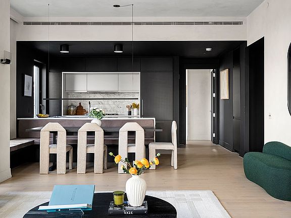 The chef's kitchen features all Miele appliances, custom grey lacquer and black cabinets, Carrara marble countertops and an oversized island. The hood that vents out of the building and the deep sink features a garbage disposal for added functionality. Custom bench sitting and a custom dining table fit perfectly and maximize the living room space.