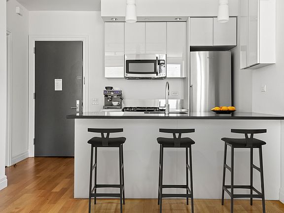 The apartment features hardwood oak floors, LED track lighting and solar shades. The kitchen includes GE profile stainless steel appliances, white Italian glass cabinets, black composite stone island and garbage disposal in the kitchen sink. A Bosch stackable washer dryer is included for your convenience.