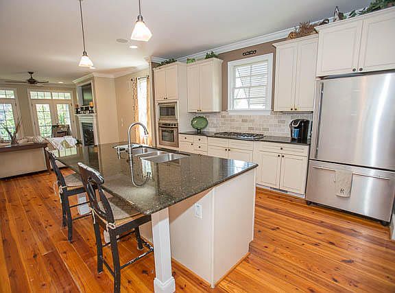 Custom designed and built 4 bedroom, 4.5 bath elevated home with a great open floor plan. Beautiful Caribbean heart pine flooring in main living areas and tile in all baths and laundry room. Large living room that is open to the kitchen with 2 sets of double doors leading to an extended screened porch. Gourmet kitchen with glazed cabinets, large 8' center island with triple sink, granite counter tops, Bosch stainless steel appliances and 36 inch gas cook top. 3 large bedrooms upstairs. 2 with Jack and Jill bathroom and the other with attached private bath. Master downstairs with dual vanity, oversized shower and jetted tub. There is also a downstairs children's playroom with built ins and bath. Minutes to downtown Charleston and Folly Beach. One of James Islands most popular neighborhoods