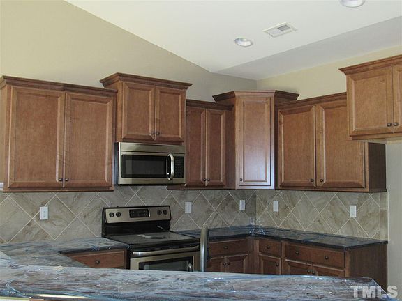 One story Bungalow on beautiful lot backing up to wooded area. Large living/rm w/gas log FP. Stained cabinets, granite counter tops & CT back splash in kitchen. Huge master suite w/his&her walk in closets, dual vanity, separate shower & garden tub. Large mud room off garage and half bath off mud room; sep laundry rm w/ utility sink. 2 car garage and covered rear porch. Builder will install 2" wood faux blinds for you . Great plan and location convenient to I-40. Won't last long!!