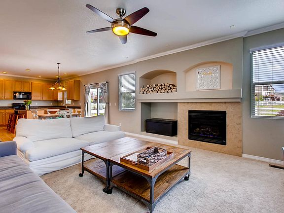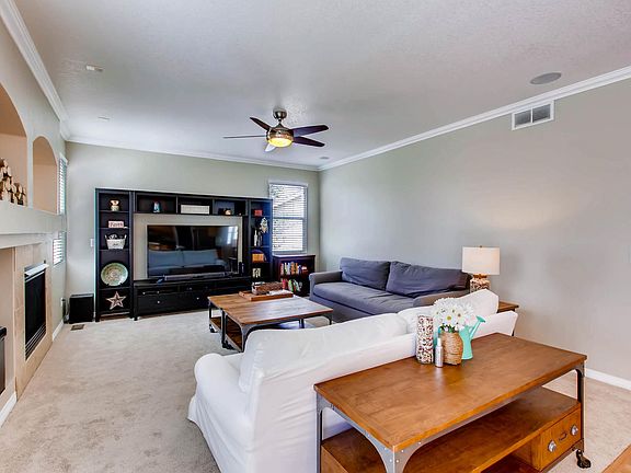 Beautiful 4 bed, 3 bath house on cul de sac and backing to greenbelt in Crystal Valley Ranch in Castle Rock! Mountain views too! Main floor den/office, family room with fireplace & ceiling fan, dining room, and kitchen w/granite counters, island, walk in pantry, crown molding, eat in area, all kitchen appliances including refrigerator included. Plantation Shutters. Lower level laundry room with cabinets and built in's. Master Suite features 5 pc bathroom and huge walk in closet. Upper floor also has loft area plus 3 more bedrooms and a full bathroom. Oversized trex deck is the focal point of the professionally landscaped, fenced backyard, with built in seating and a gas line run for the BBQ. 2 car attached garage. Low HOA dues include use of community pool and clubhouse! In nationally recognized Douglas County School District. Newer roof. Wood floors.