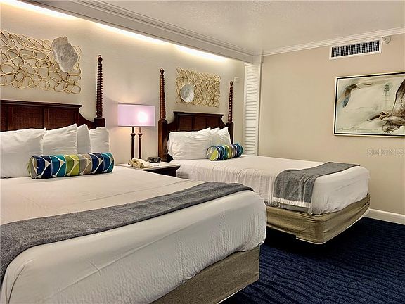 Condo-Hotel at Tradewinds. Are you looking for a business opportunity that is hands off? Looking for steady income with absolutely no work from you? Earn over 5% annually and get nearly a MONTH FREE VACATION when not booked? This 535 square foot plus balcony unit features 2 queen beds, kitchen, great room with sleeper sofa, sleeps 6 comfortably, 2 big screen TV's, balcony with view of the Gulf of Mexico, one of the pools, the tranquil paddle boat lagoon and more. Fully updated in 2020. Unit is turn key and part of the condo-hotel program. Perfect for 1031 exchange. You say you can't take a month long vacation at a St Pete beach resort? How about up to 28 days a year at the beach for personal vacations or a place for business associates or family? And, as an owner and beyond your 28 free days, you get access all year to the facilities, including the seven pools, fitness center, put put golf, paddle boats, tennis courts, the super water slide and discounts on paid amenities, the gift shop and meals. Condo-hotel is NOT A TIMESHARE. You own it the whole year. Tradewinds Resort and Spa does all the marketing, booking, cleaning, maid service, upkeep, maintenance and pays all the insurances and utilities. You just get monthly deposits from all the guests that THEY check into your room. And the biggest attraction is Rumfish/Tradewinds resorts and spa own just under a quarter mile of sugar white sand beach on St Petersburg beach, where you'll enjoy endless crashing waves, warm breezes and spectacular sunsets all year round. Additional shopping and restaurants are only steps from the resort up and down Gulf Blvd. Call for more information on how you can work this opportunity into your portfolio.