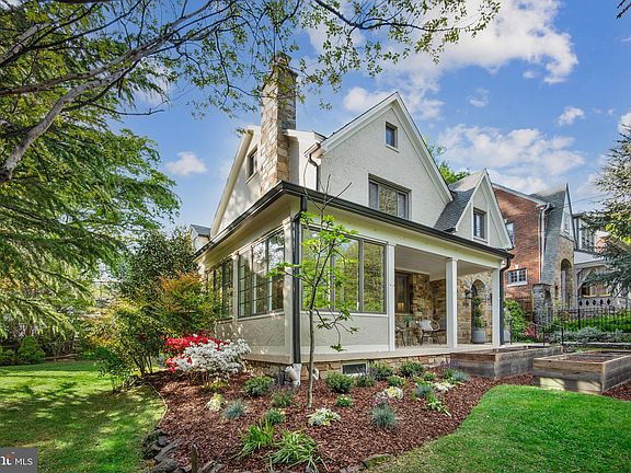 Stunning storybook Tudor home in Chevy Chase features 4 bedrooms and 5.5 baths with a detached 2-car garage on a double corner lot! This surprisingly spacious home exudes old-world charm across 3,985 finished square feet of light-filled living space. A covered front porch welcomes you in to a generously sized formal living room with stone fireplace that steps to a tiled sunroom. The kitchen features quartz counters, stainless steel appliances and an island and opens to a family room and dining room. Step from the kitchen to a private rear patio that's perfect for entertaining. Upstairs, find a large primary bedroom with vaulted ceiling, a luxurious updated bath, coffee/wet bar area, and a dressing/sitting room. A conveniently located laundry closet and two more en-suite bedrooms round out the upper level. An attic level adds a fourth bedroom with sitting area, walk-in cedar closet and private bath. The lower level features a spacious rec room with a fireplace, a full bath, loads of storage and a rear walk-up to a fully fenced back yard complete with a pergola, koi pond, raised garden beds and parking pad. Ideally located just steps from Rock Creek Park, the Chevy Chase Farmers Market, and Connecticut Ave shops, dining and entertainment!