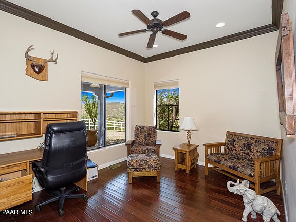 Excellent opportunity with this 21+ Acre Horse Property having a Custom Built 2981 Sq Ft Santa Fe with INCREDIBLE VIEWS plus Outstanding Well....Bordering BLM land only 60 minutes to Phoenix and 30 minutes to Prescott!!! Features a 3Bedroom/3Bathroom/6CarGarage Spaces, GREAT ROOM Concept, Formal Dining Room or Den with Coffered Ceiling, Open/Split Floor Plan, 2 Master Suites with Jack & Jill Setup, 1 Mini Master, Powder Room, Honed Brazilian/Cherry Wood Floors & 16'' Tile for flooring, Gas Fireplace with Stone Chimney Face, Ceiling Fans, Bose Surround Sound system, & upgraded lighting throughout. Kitchen is Beautiful with Maple Cabinetry w/Dove Tailed/Soft Close Drawers w/100% Extension, GRANITE Countertops, ISLAND, Eat In Kitchen, Built In Pantry, Stainless Steel CONTINUED...