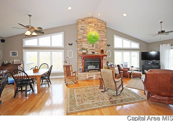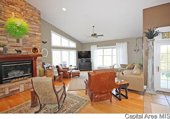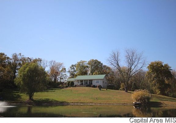 HUNT OUT YOUR BACK DOOR!! This unique 3BR ranch w full fin W/O LL is tucked on 6.7 acres of beautiful timber w 30x20 outbuilding, fully stocked pond & loaded w wildlife, located just 15 miles west of Springfield. Awesome lodge-like features w open great room, HW flooring, stacked stone FP (vaulted ceilings), Cherry cabinetry w granite tops, SS appliances, screened porch leads to maintenance free deck overlooking acres of timber & creek! Master suite w garden tub, W/I shower & W/I closet. 2 car attached garage. Horses welcome, geothermal, Pleasant Plains Schools!