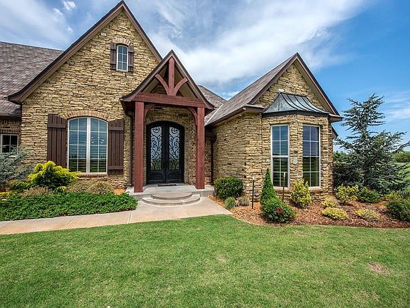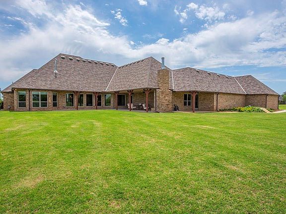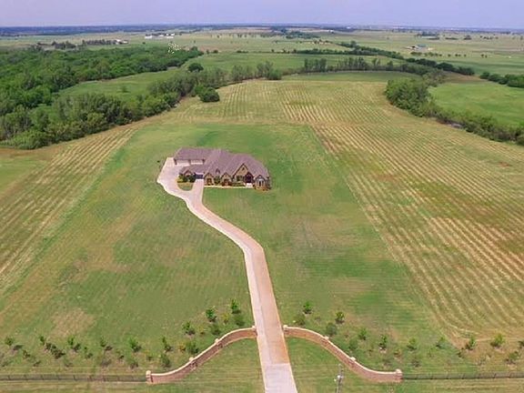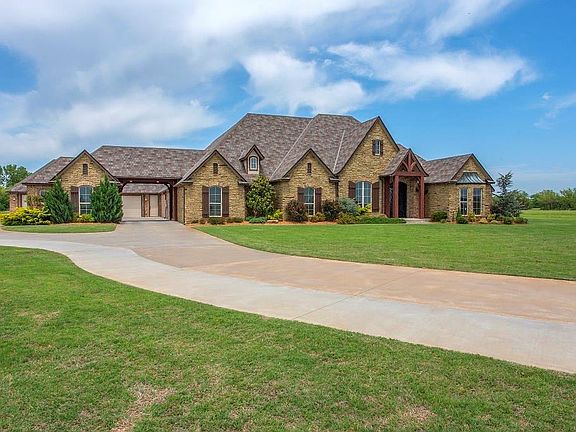Stunning Northwest Norman Estate on 20 acres! This 4 bedroom/3.5 bath, single story home, features 10' to 14' ceilings and 8' doors throughout with an open floor plan featuring a large Great Room with gorgeous views, a Dining Room, Study and a Chef's Kitchen with gas range, double oven and walk-in pantry. A large Media/Game Room opens up to an oversized outdoor living space with a fireplace and hookups for an outdoor kitchen. The Master Suite has a large sitting area with beautiful views and includes an en suite bathroom with a sizeable walk-in closet. Lots of custom built-ins and storage throughout including in the large Mudroom which connects to an oversized 5 car garage. Connected to the house by a porte-cochere is a large heated and cooled flex space that currently serves as the home gym.The 20 acre grounds feature 660' of fenced frontage lined with trees, as well as a massive brick and rock entry wired for a custom gate and a sprinkler system on a dedicated irrigation well.